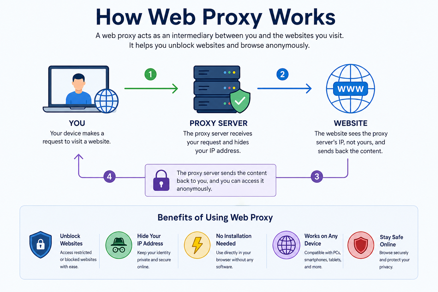 When you use a web proxy, your request is sent to a proxy server first. The proxy server then fetches the website on your behalf and returns the data to your browser. This process hides your real IP address and allows you to access content that may otherwise be restricted.